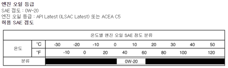 24년형 더 뉴 레이의 1.0 MPI 엔진이 요구하는 엔진오일 규격은 현 시점 기준으로 API SP 또는 ACEA C5 그리고 허용점도는 0W-20 단일 규격 입니다.
