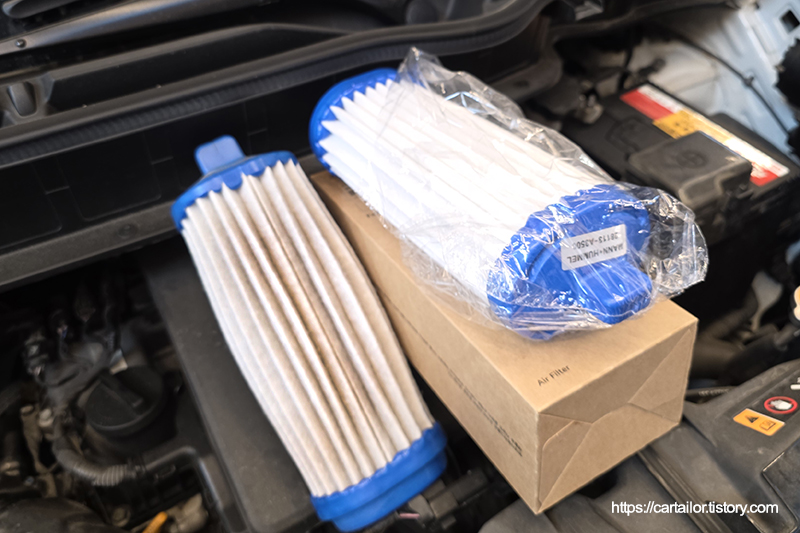 에어클리너를 신품으로 교체합니다. 적은 엔진룸 공간 때문인지 필터 형상도 특이하고 장착도 다소 까다롭습니다.