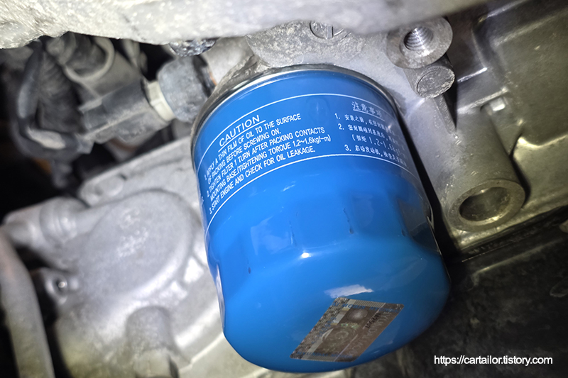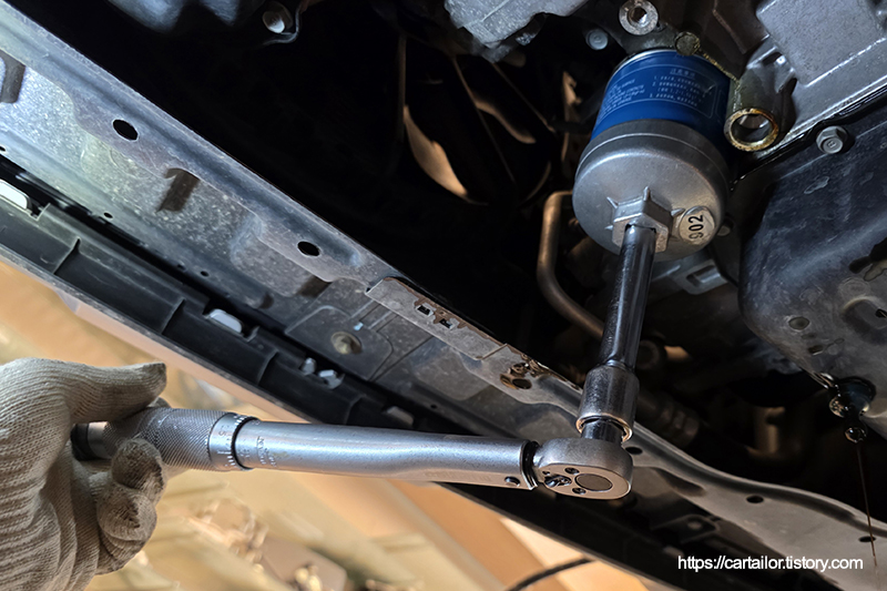 신품 오일필터 씰에 신유를 바른 뒤, 토크렌치를 이용해 규정 토크로 체결합니다.
