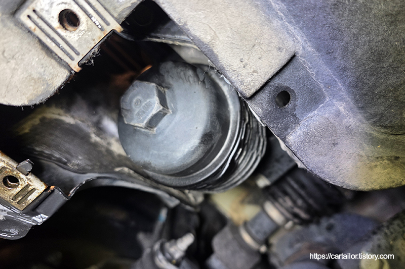 서비스 커버를 탈거 후, 기존 오일필터와 사용유를 제거합니다.
