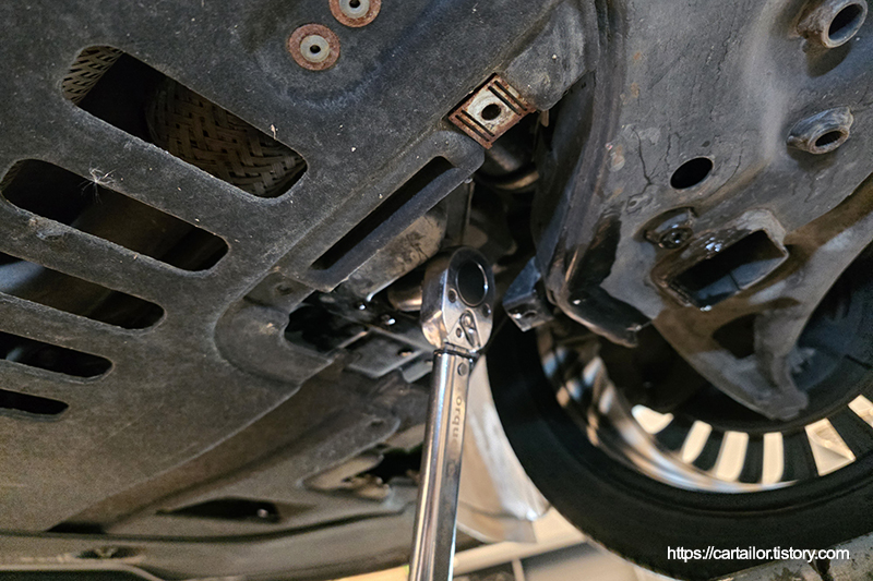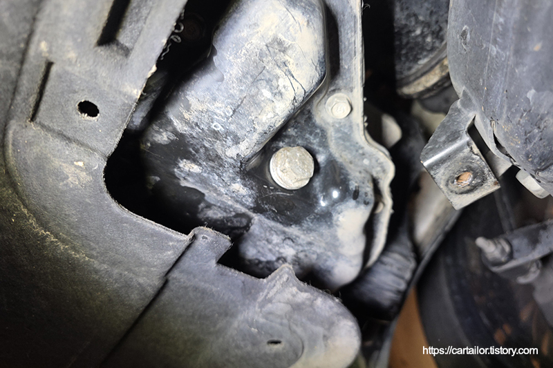 오일 배출이 끝났으면 와셔를 신품으로 걸어준 뒤, 규정 토크로 체결해 마무리합니다.