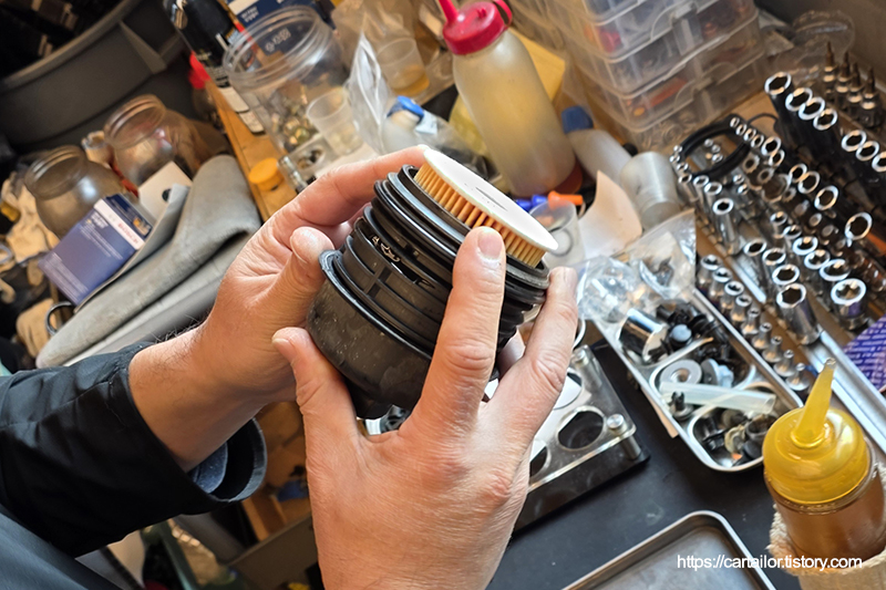 세척 및 건조가 끝난 필터캡에 신품 필터, 오링을 장착한 뒤, 모든 접촉면에 신유를 발라줍니다. 필터캡을 손으로 돌려준 뒤, 토크렌치를 이용해 규정 토크로 체결합니다.