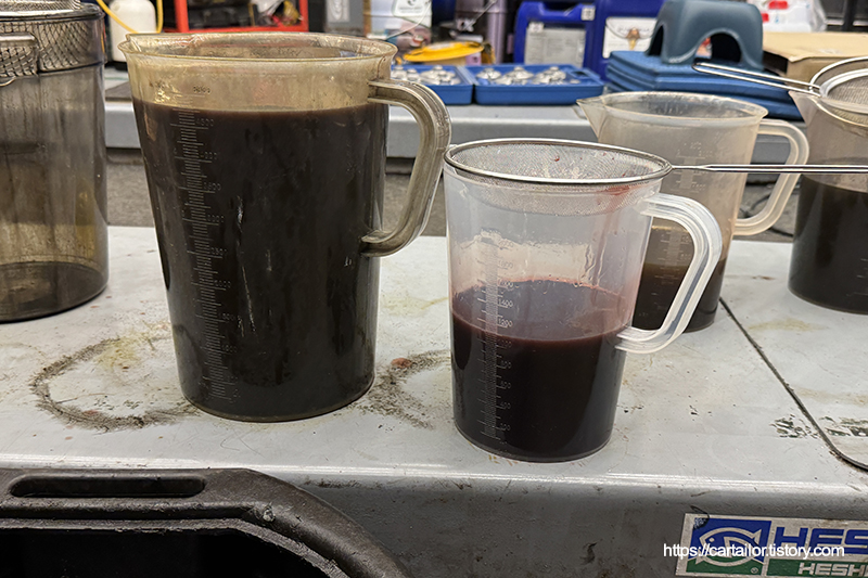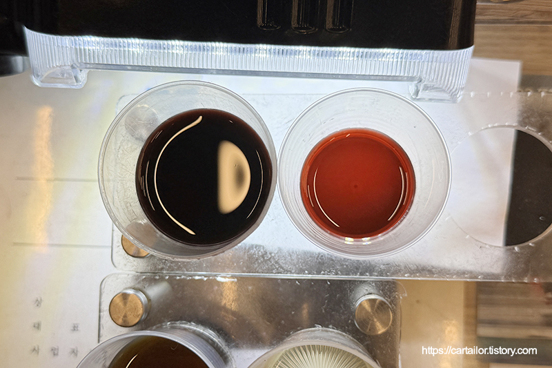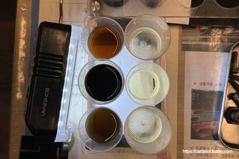 좌측부터 기존 미션오일, 레벨링 시 배출된 오일입니다. 우측이 현재 차량의 변속기 오일 상태로 보시면 되겠습니다.