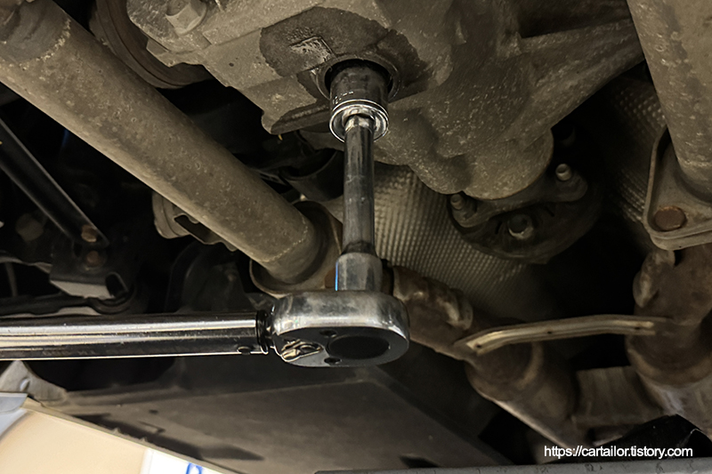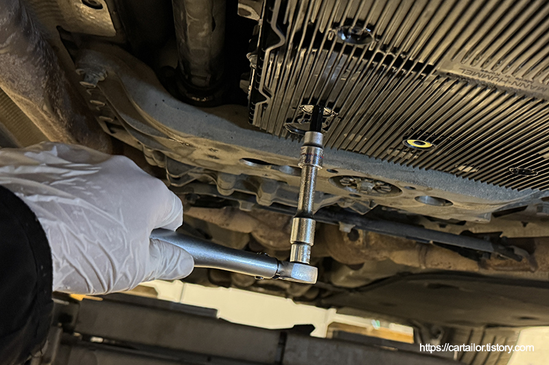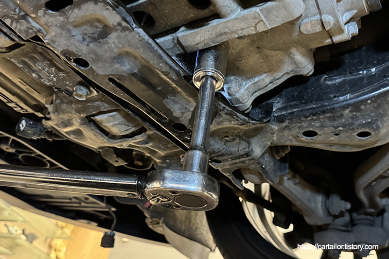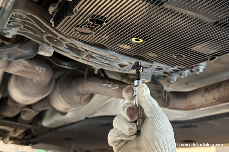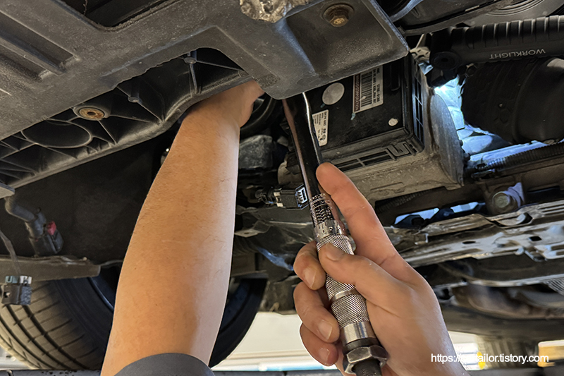 오일 배출이 완전히 끝났으면 드레인플러그를 손으로 돌려준 뒤, 토크렌치를 이용해 규정 토크로 체결합니다.