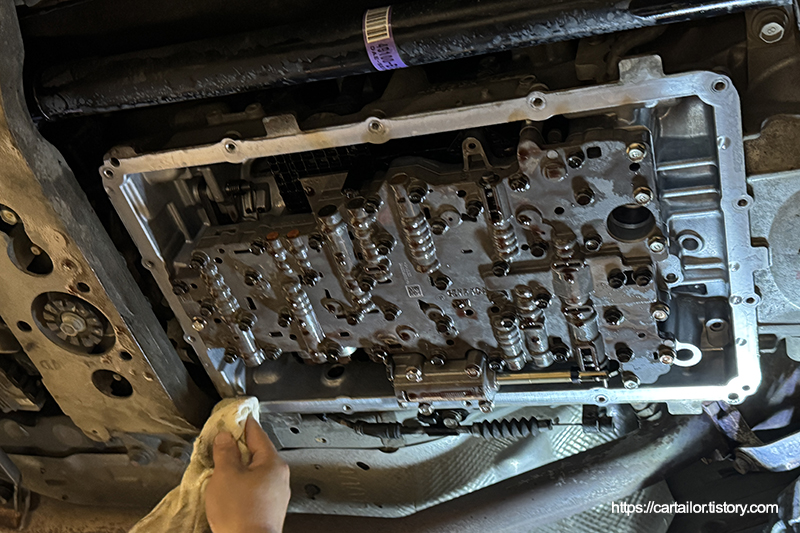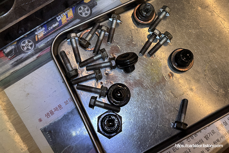 기존 미션오일을 배출 후, 오일팬을 제거합니다.