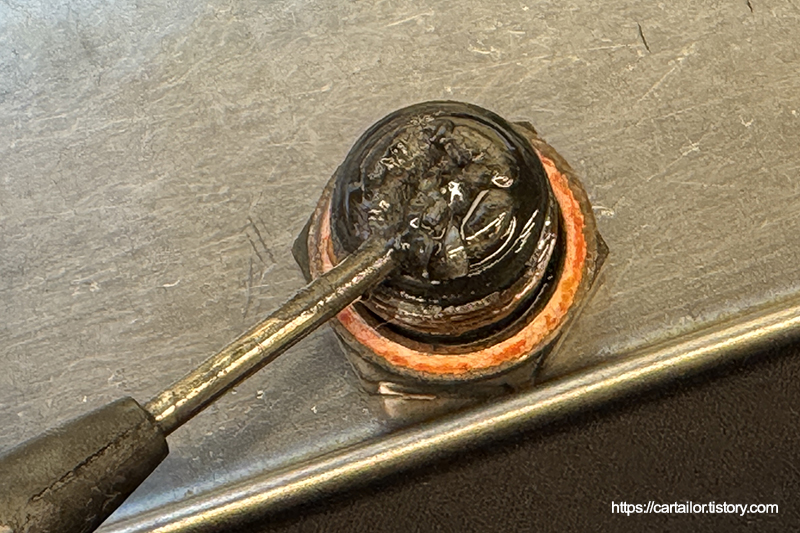 전용 씰란트가 발린 신품 드레인플러그 그리고 신품 와셔를 사용하며, 세척 및 건조를 마친 주입구플러그에 신품 와셔를 걸어줍니다.