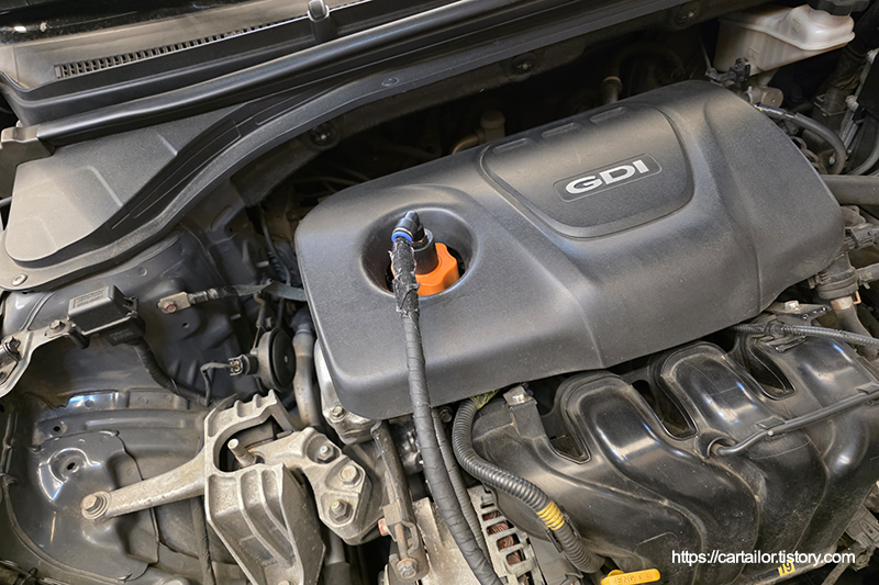 자연 낙하 방식의 배출이 끝났으면 배출구 형상에 맞게 차를 기울인 뒤, 압력이 걸리지 않을 정도의 세기로 에어를 세팅해 잔유를 최대한 많이 배출합니다.