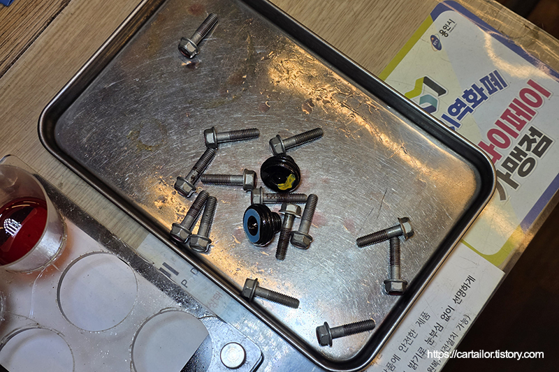 오일팬을 장착한 뒤, 신품 고정 볼트를 손으로 돌려 가고정합니다. 오일팬 위치 조정이 끝났으면 모든 규정 볼트들을 토크렌치를 이용해 규정 토크로 체결합니다.