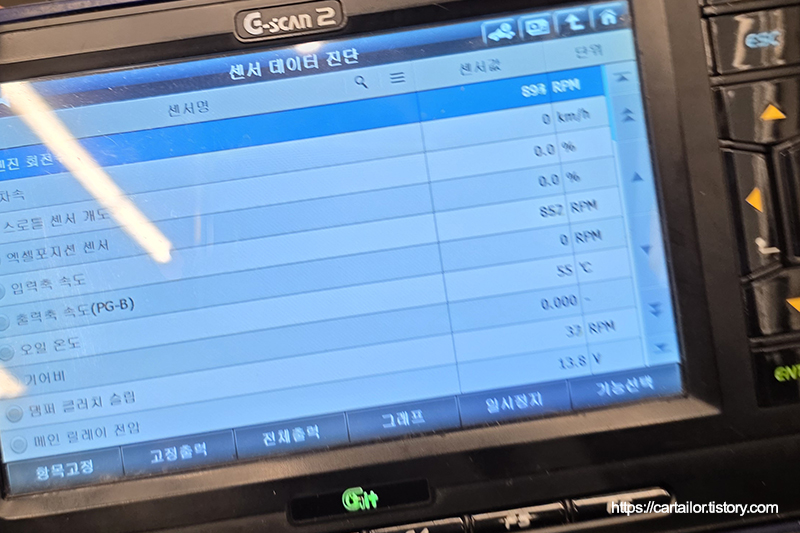 입고 직후 확인한 미션오일 온도로, 오일을 배출하기엔 온도가 높아 팬을 이용해 식히는 시간을 갖습니다.