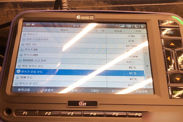 다시 시동을 거는데, 유온이 턱 없이 낮습니다. 지침서상 82도~93도 사이가 레벨링을 보는 유온 구간입니다. 역시 GM과 공동개발한 미션이라, 레벨링 온도가 매우 못됐습니다. 설명서에는 친절하게 30키로 이상 운전하면 해당 온도범위에 도달한다고 하고 있으나, 가게를 비우고 손님차를 끌고 30키로씩 드라이브를 하고 오기는 불가능합니다.