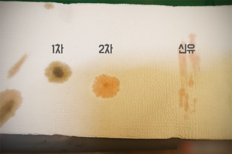 교환 후 배출된 미션오일입니다. 우측 2차 드레인시 보다 붉은색이 돌면서 신유에 가까운 상태를 보이는 것을 확인 할 수 있습니다. 저 상태에서 신유를 한번 더 주입하였으니, 변속기 내부에 있는 오일의 상태는 신유와 크게 다를 것이 없습니다.