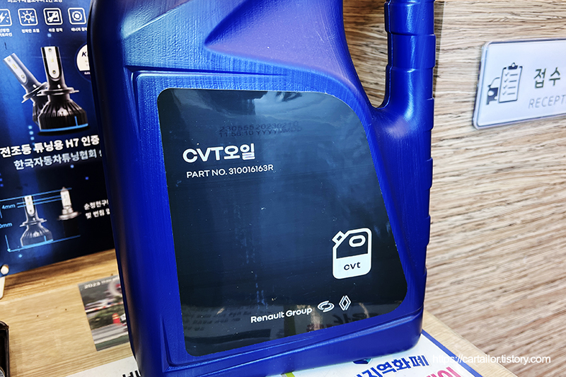 주입할 오일은 르노삼성 정품 CVT오일입니다. CVT 변속기의 경우 자동변속기와 원리나 요구되는 마찰 지수가 완전히 다르기 때문에 반드시 규격에 맞는 전용 오일을 사용해야 합니다. 일반적인 자동변속기 보다 월등히 높은 점도를 갖고 있거든요.