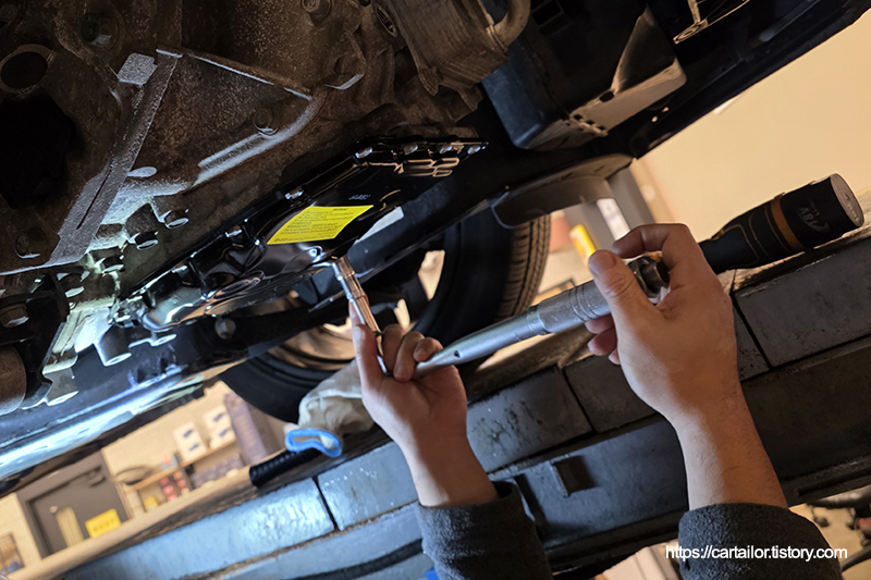 밸브바디커버를 장착 후, 신품 고정 볼트를 손으로만 돌려 오일팬 위치 조정이 가능하도록 해줍니다. 오일팬과 가스켓의 위치가 정위치가 되었으면 토크렌치를 이용해 모든 고정 볼트들을 규정 토크로 체결합니다.