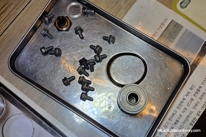 교체할 부품들의 모습입니다. 밸브바디 커버 안쪽에 위치한 IVTF필터, 변속기 측면에 위치한 압력필터 그리고 밸브바디커버(오일팬)과 신품 고정볼트류, 마그넷 그 외 기타 소모품들도 함께 준비했습니다. 오일팬의 경우 메뉴얼상 가스켓만 신품으로 교체하고 재사용하게 되어 있으나 가격이 비싸지 않아 그냥 신품으로 교체하여 재사용시 혹시 모를 기존 팬의 변형등에 의한 누유발생의 가능성까지 원천 차단하였습니다.