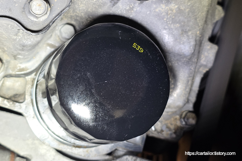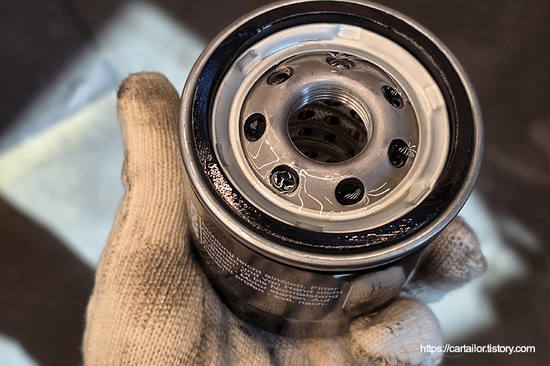 잔유가 배출되는 동안 오일필터를 준비합니다. 캔타입이기 때문에 엔진쪽 장착면을 잘 클리닝 후 건조하고 필터 오링에 신유를 살짝 발라 조립 중 오링이 변형되거나 파손되지 않도록 합니다. 조립은 손으로만 꽉 잠근 후 특이사항이 없으면 토크렌치를 사용하여 규정된 잠금값으로 마무리 체결 합니다.