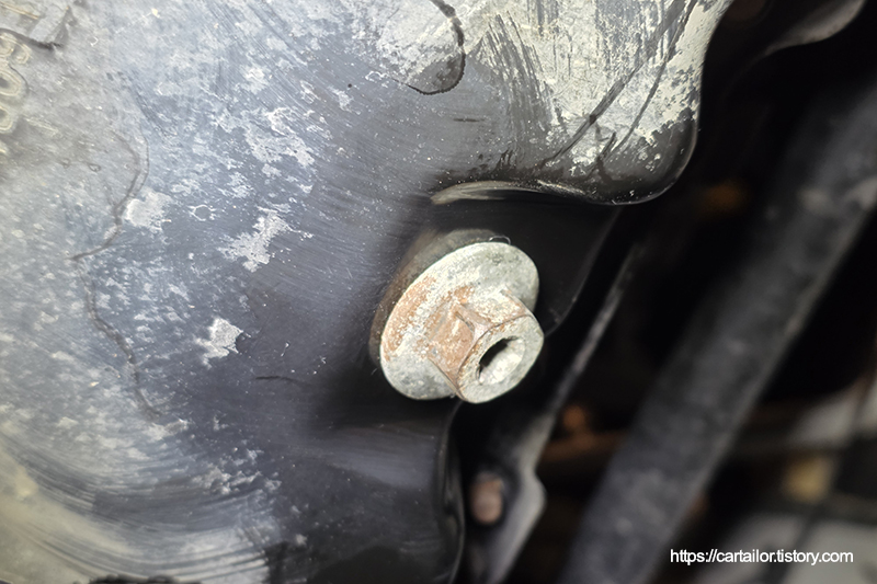 드레인볼트의 고무 오링도 신품으로 교체 합니다. 오일필터와 마찬가지로 오링에 신유를 살짝 도포해 손으로만 꽉 잠근 다음, 토크렌치를 사용하여 규정 토크로 체결합니다.