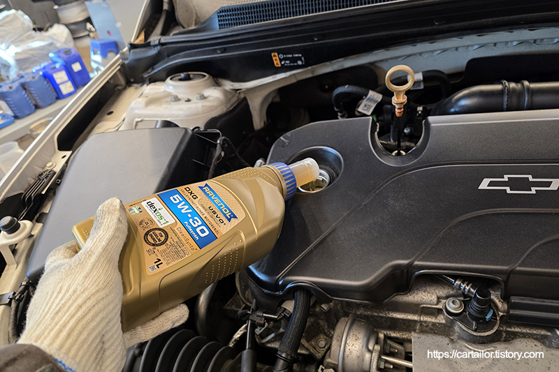 주입할 신유는 라베놀 DXG 5W-30제품으로, 쉐보레 DEXOS1 GEN3 규격의 공식 승인유이며, 에스터와 PAO를 베이스로 하는 4기유 및 5기유로 구성된 베이스유 기반에 DEXOS1 GEN3 첨가제 패키징이 첨가된 100% 합성유입니다.