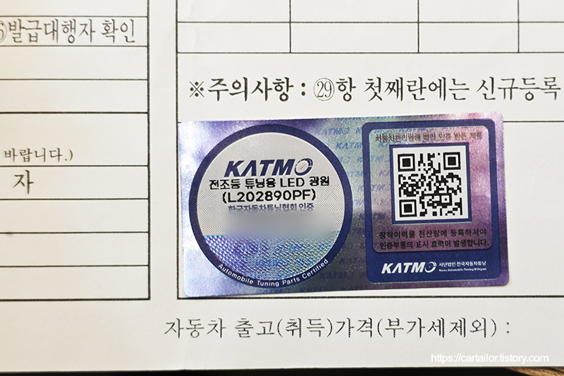 차량등록증에 사전 인증 스티커를 부착 후, 튜닝인증센터에 전산등록까지 마쳐야 합법 튜닝으로 인정됩니다. 등록증만 잘 챙겨오시면 관련 절차까지 모두 진행 후 출고합니다.