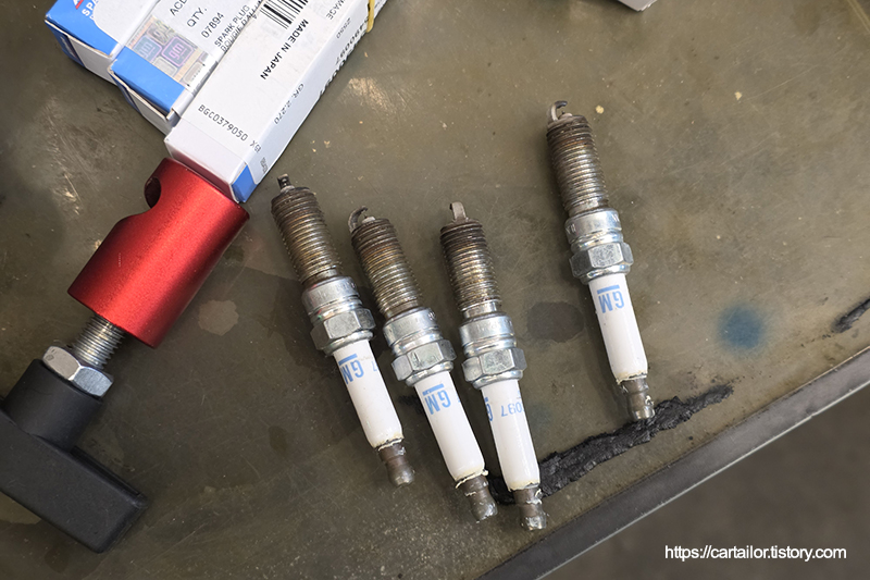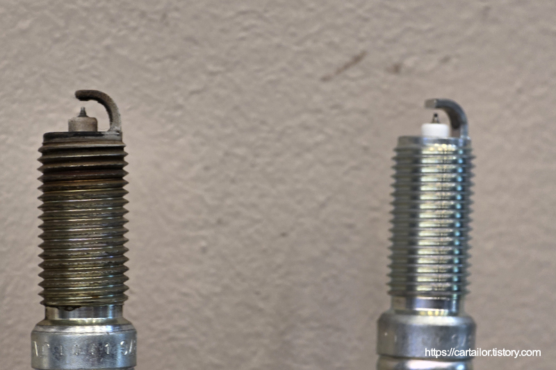 점화코일을 탈거 후, 기존 플러그 4개를 제거합니다. 좌측은 신품, 우측은 고품입니다. 접지전극 부분이 마모 되면서 간극이 벌어진 모습이 확인됩니다.