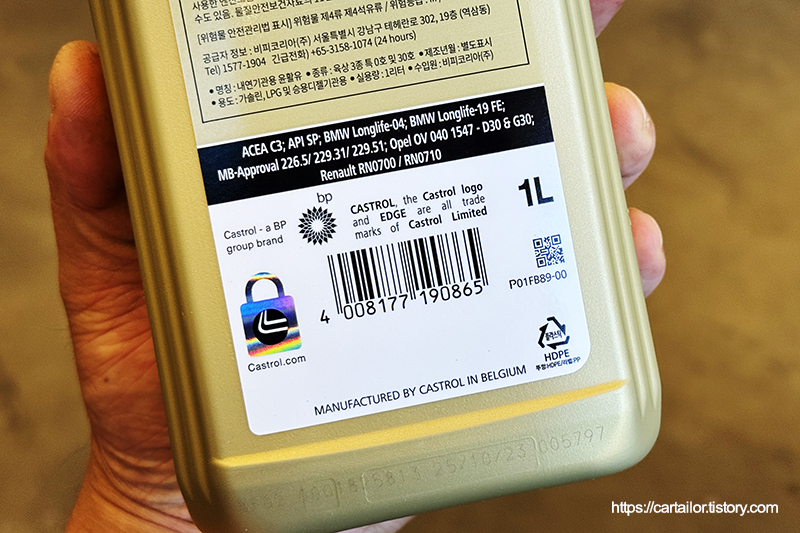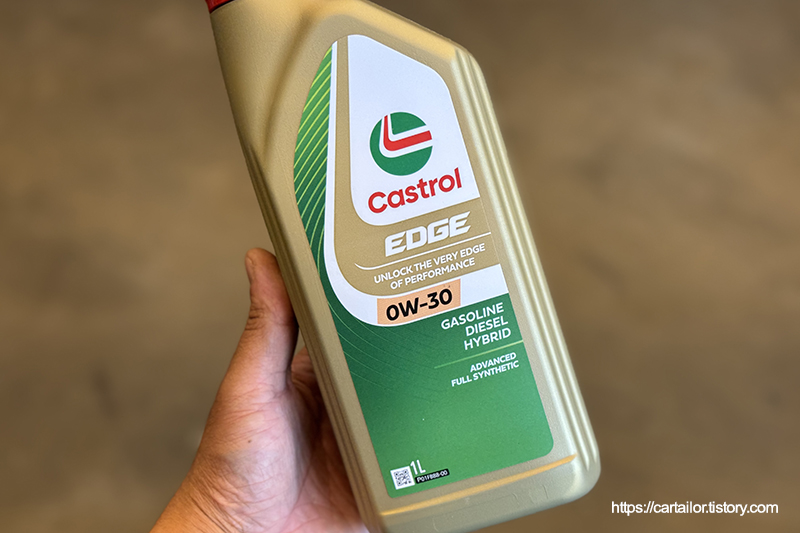 주입할 엔진오일은 캐스트롤 엣지 0W-30입니다. 해당 차량이 요구하는 엔진오일 규격과 점도와 정확히 일치하는 100% 합성유입니다. 세계적으로 유명한 메이커인 만큼 병행수입품도 많고 가품이 많이 유통되는 제품이기도 합니다.