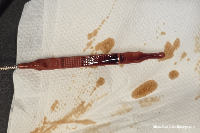 열간 상태에서 시동을 끄고 수분 후, 딥스틱을 뽑아 오일량을 확인합니다. 정량 잘 세팅되었습니다.
