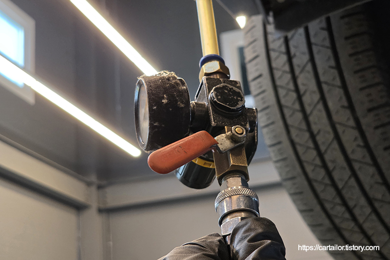 자연 낙하 방식의 배출이 끝났으면 배출구 형상에 맞게 차량을 기울인 뒤, 압력이 걸리지 않을 정도의 세기로 에어를 불어넣어 자연 낙하 방식만으로는 나오지 않는 잔유를 배출합니다.