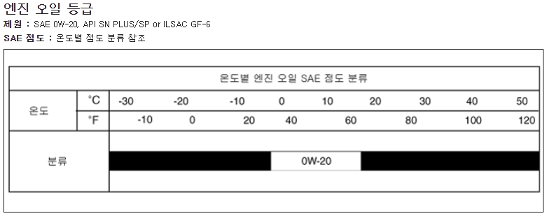 더뉴아반떼 엔진오일 제원은 이와 같습니다. SN+/SP 혹은 GF-6 이상의 단일 점도입니다.
