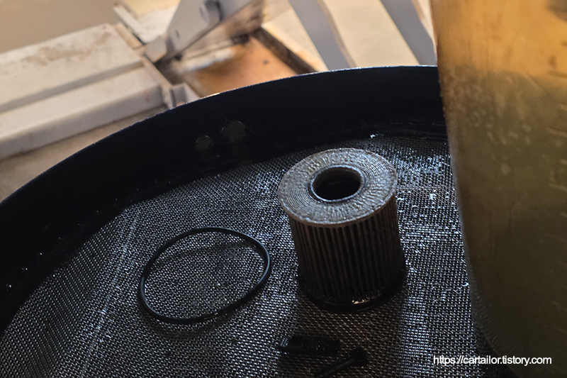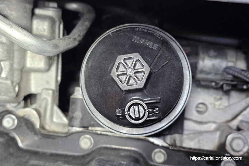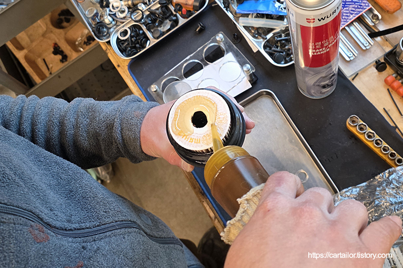 세척 및 건조가 끝난 필터캡 접촉면에 신유를 발라 윤활 후, 신품 오링과 필터를 장착합니다. 토크렌치를 이용해 규정토크로 체결합니다.