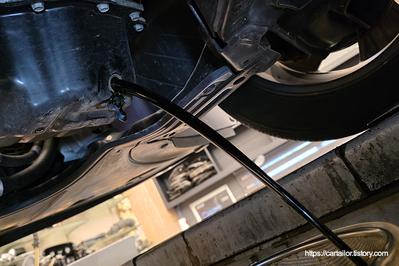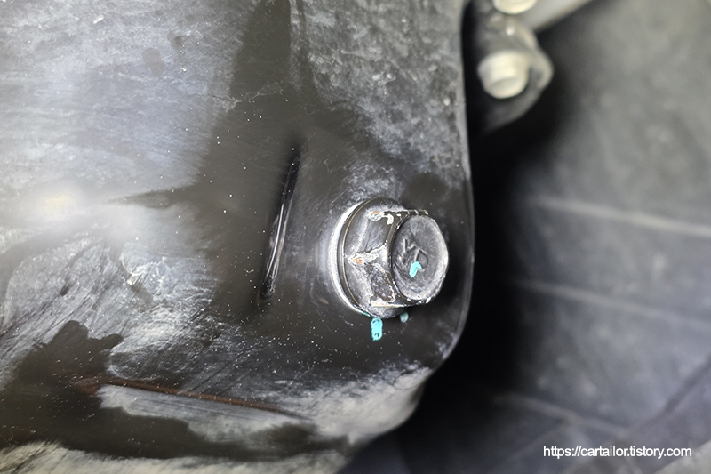 출고 이후 한 번도 교환이력이 없었던 드레인플러그 와셔를 제거 후, 신품으로 교체합니다. 오일 배출이 끝났으면 규정 토크로 조여 마무리합니다.