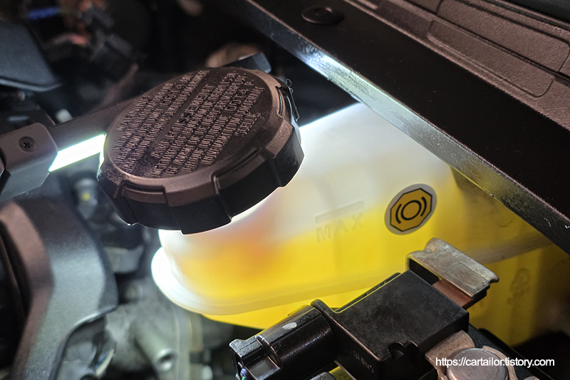 시운전을 다녀온 뒤, 브레이크액 레벨을 확인합니다. 세팅한 대로 잘 유지되고 있습니다.