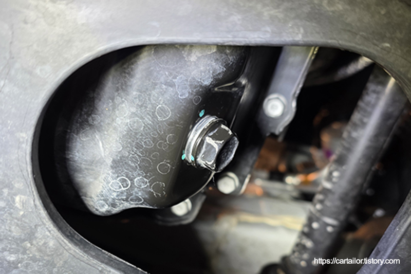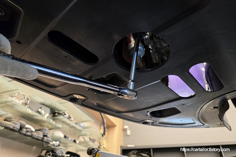드레인플러그 와셔를 제거 후, 신품으로 교체합니다. 오일 배출이 끝났으면 규정 토크로 조여 마무리합니다.
