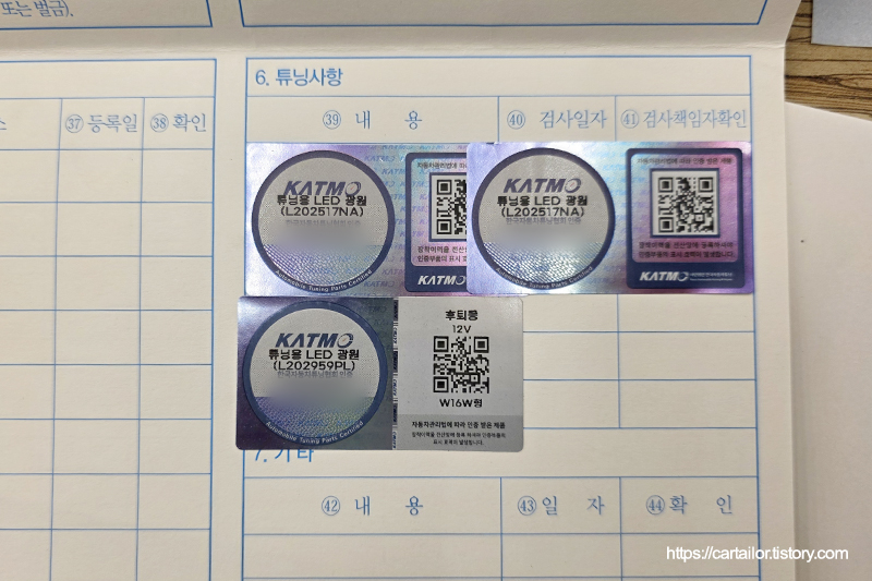 브라비오와 같은 자기인증 튜닝 제품들에 대한 등록 절차가 남아있습니다. 차량등록증에 사전 인증 스티커를 부착 후, 튜닝인증센터에 전산등록까지 마쳐야 합법 튜닝으로 인정됩니다. 등록증만 잘 챙겨오시면 관련 절차까지 모두 진행 후 출고합니다.