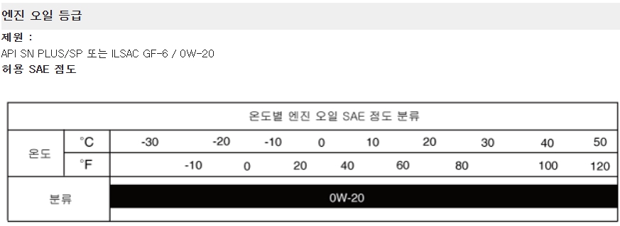 해당 차량의 엔진오일 제원은 이와 같습니다.