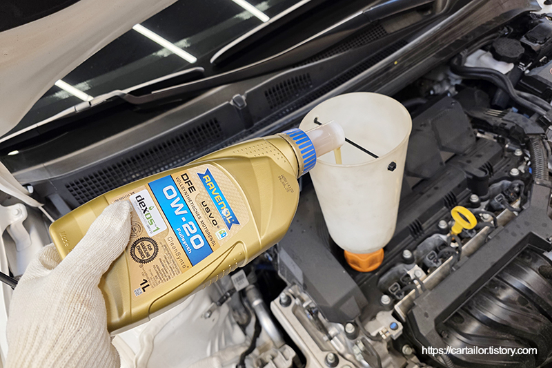 주입할 엔진오일은 라베놀 DFE 0W-20입니다. RAVENOL의 플래그쉽 USVO 라인이며, API 기준 최신 등급인 SP 및 GM dexos1 3세대 공식 인증 오일입니다.