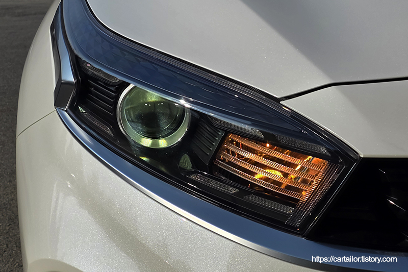 미등과 정지등은 LED인 반면 방향지시등(전, 후면)과 후진등이 할로겐 사양으로 적용되어 있어 미관상 그리고 시인성 측면에서 다소 아쉬운 점이 있습니다. 후면 등화장치의 디자인은 제법 완성도가 높은데 할로겐 광원이 세련미를 떨어뜨리는 경향이 있습니다.