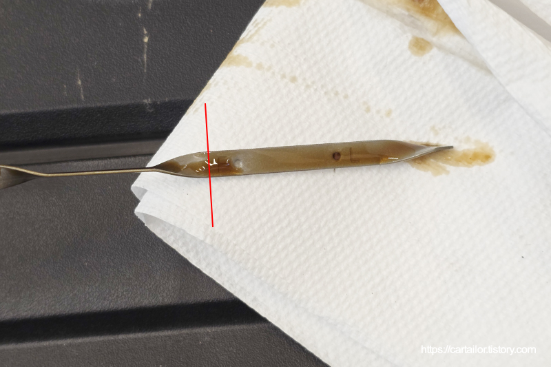 열간 상태에서 시동을 끄고 수분 후, 딥스틱을 뽑아 레벨을 체크합니다. 정량 잘 주입되었습니다.