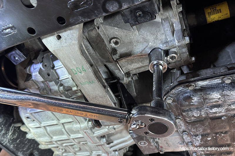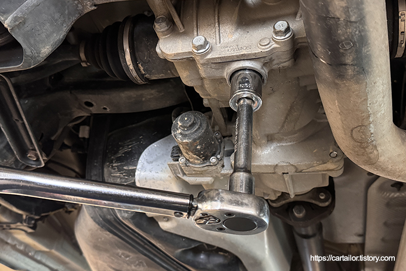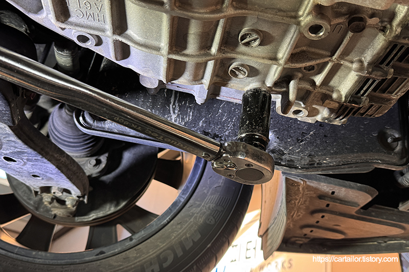 오일 배출이 완전히 끝났으면 플러그를 손으로 돌려준 뒤, 토크렌치를 이용해 규정 토크로 체결합니다.