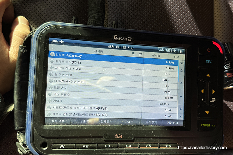 입고 직후 확인한 미션오일 온도로, 오일을 배출하기엔 유온이 다소 높아 다른 작업 먼저 시작합니다.