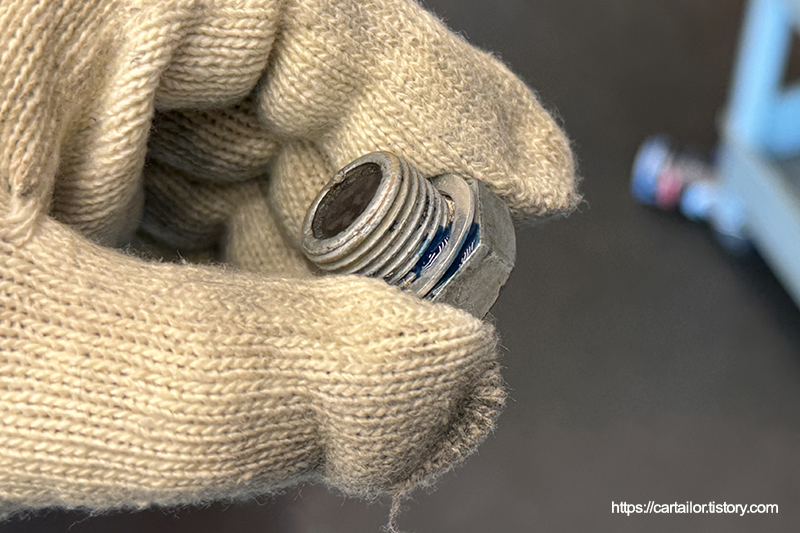 드레인플러그는 자성을 띄고 있어 정상적인 마모에 따른 메탈성 슬러지를 포집하고 있습니다. 별다른 이물질은 없어 특이사항은 없어 보입니다.