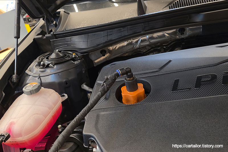 잔유 제거를 위해 전용 어답터와 호스를 연결한 뒤, 차량을 리프팅합니다.