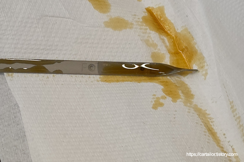 열간 상태에서 시동을 끄고 수분 후, 딥스틱을 뽑아 레벨을 체크합니다. 정량 잘 주입되었습니다.