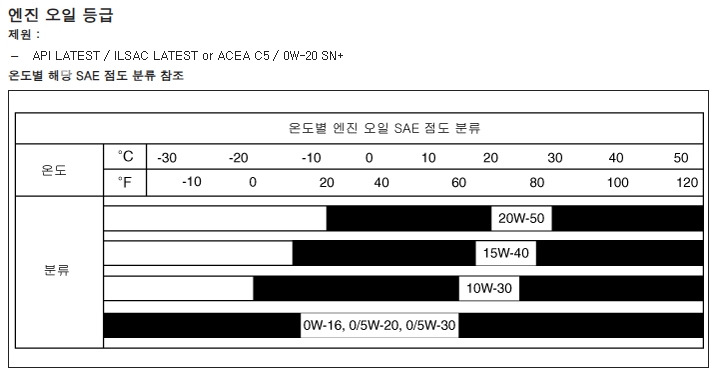 해당 차량의 엔진오일 제원은 이와 같습니다.