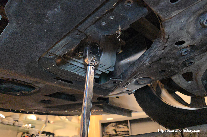 신품 프리 드레인플러그 오링에도 신유를 바른 뒤, 토크렌치를 이용해 규정 토크로 체결합니다.