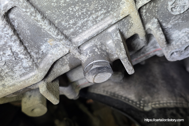 레벨링플러그를 개방해 과주입된 미션오일을 배출합니다. 레벨링플러그 오링을 신품으로 교환한 뒤, 오일이 미량 혹은 방울 단위로 떨어질 때, 레벨링플러그를 체결합니다.