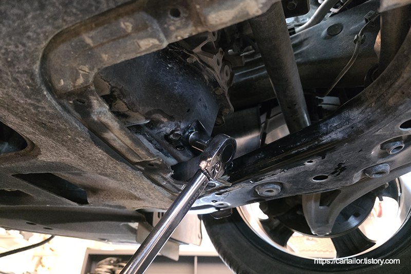 드레인플러그 와셔를 신품으로 교환합니다. 오일 배출이 완전히 끝났으면 와셔를 교체한 드레인플러그를 손으로 돌려준 후, 규정 토크로 체결합니다.