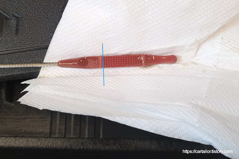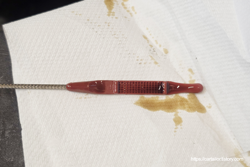 시동을 끄고 수분 후, 딥스틱을 뽑아 상태를 체크합니다. 상태, 오일량 모두 양호합니다.