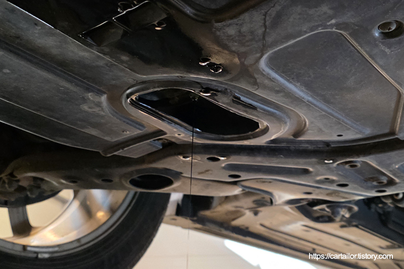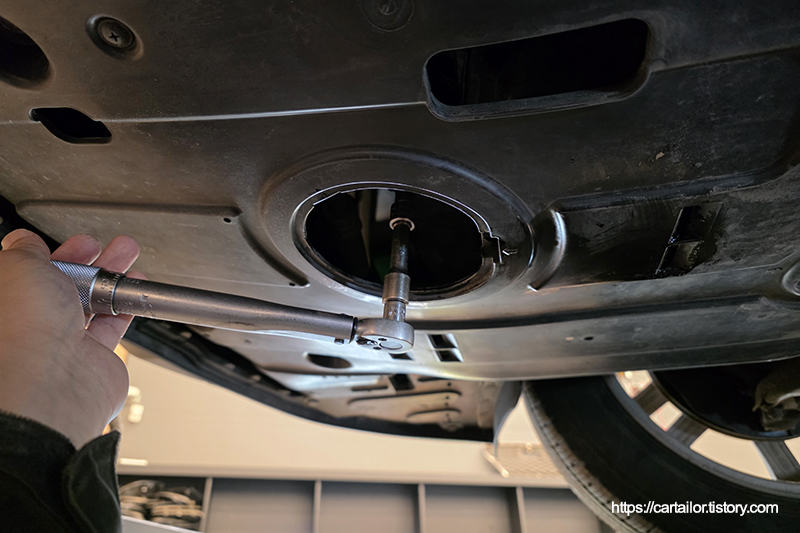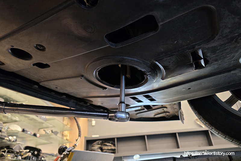 오일 배출이 끝났으면 와셔를 신품으로 교환한 드레인플러그를 손으로 돌려준 뒤, 규정 토크로 체결합니다.