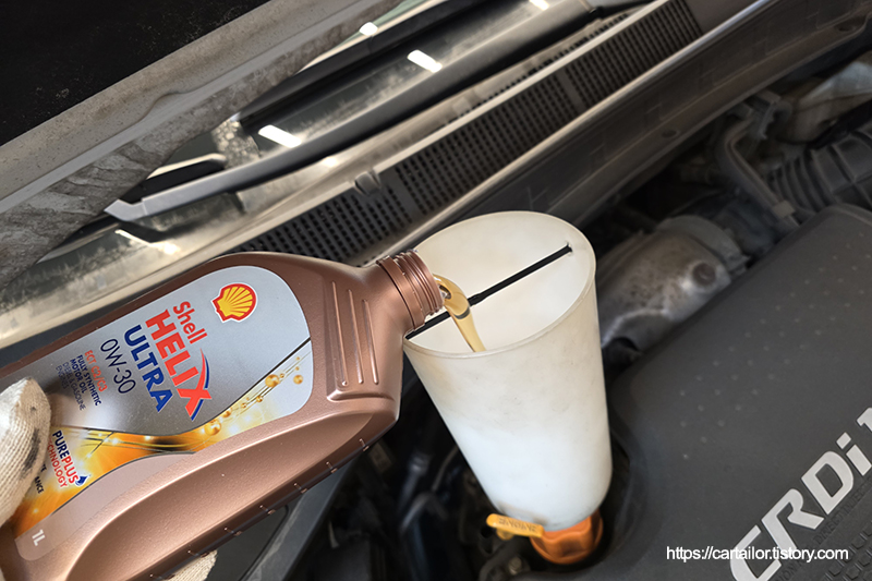 계산된 용량의 신유를 주입 후, 시동을 걸어 오일을 순환시킴과 동시에 온도를 올리는 시간을 갖습니다.