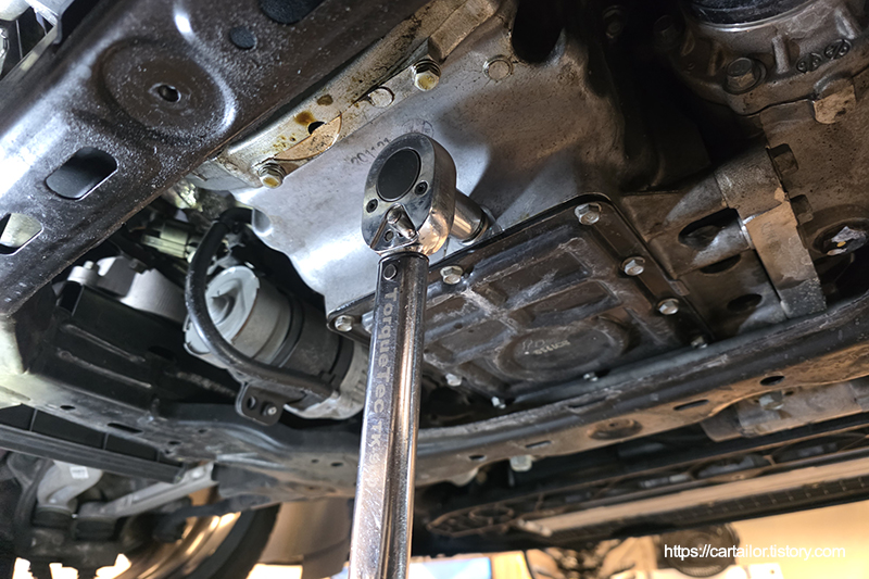 오일 배출이 끝났으면 드레인플러그와셔를 신품으로 교체 후, 토크렌치를 이용해 규정 토크로 조여줍니다.