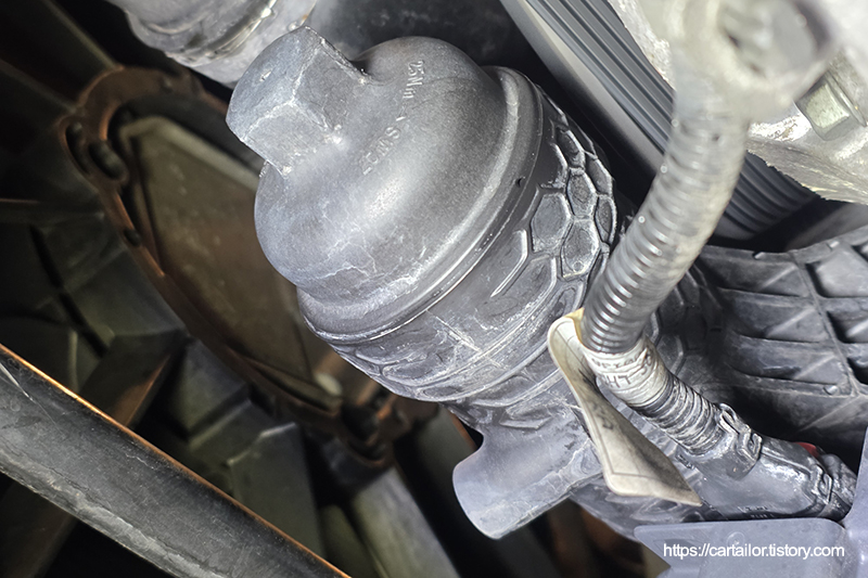 세척 및 건조를 마친 필터캡에 신품 오링, 필터를 결합합니다. 모든 접촉면에는 신유를 바른 뒤, 토크렌치를 이용해 규정 토크로 체결합니다.